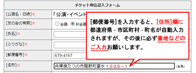 チケットNET予約の送信日から、1週間経っても当ホールからご予約確定の連絡(電話・メール・FAX)がない場合は、メール不具合が生じている可能がありますので、お手数ですがご連絡くださいますようお願いいたします。 [窓口引換]・・・ご予約から約1週間以内に赤とんぼ文化ホール事務所窓口へお越しください。※公演日当日の引取りではありません。ご注意ください。引き取り期限が過ぎた場合、予約無効・キャンセルとなります。 [代金引換]・・・「代金引換郵便」でチケットをお送りします。郵便局から配達されたチケットをお受け取りの際、チケット代金+代金引換手数料等(ご予約時にお知らせします)をお支払いください。 [住所]欄の番地などの入力漏れにご注意ください。 ![]() |